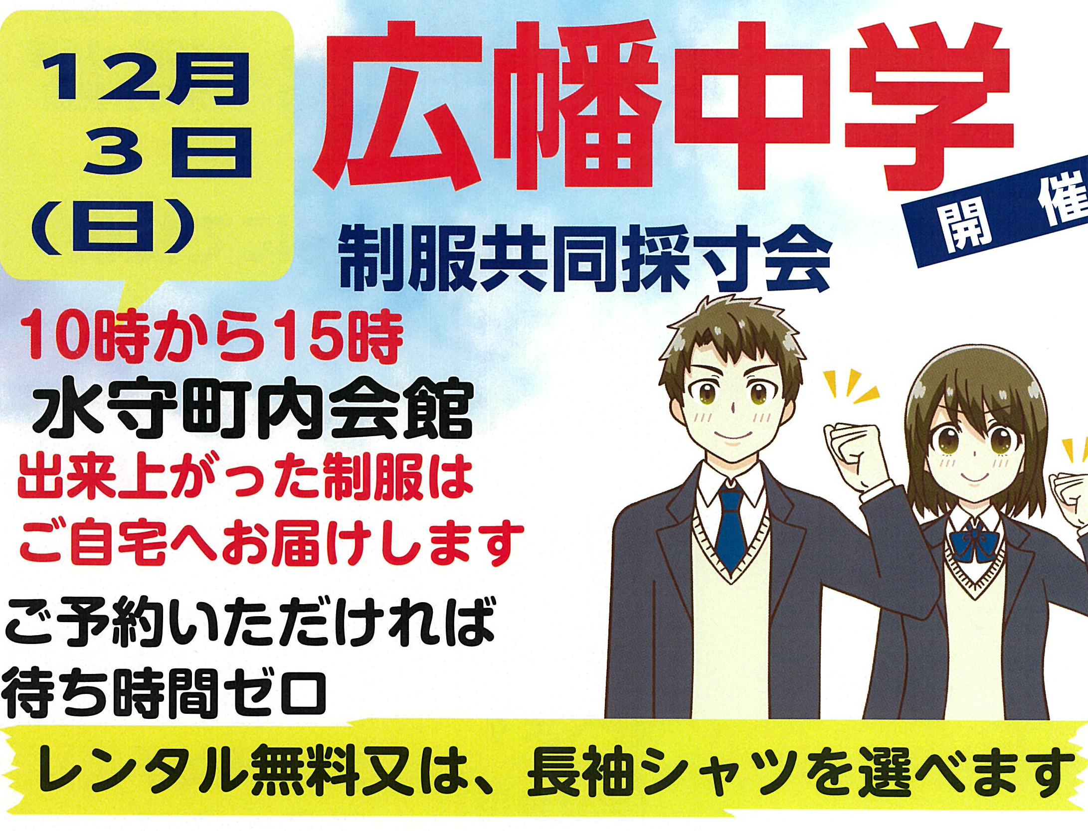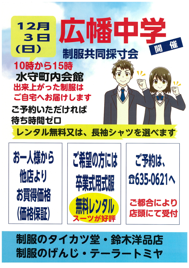 12/3に広幡中学校の取り扱い店共同で制服採寸会を行います。